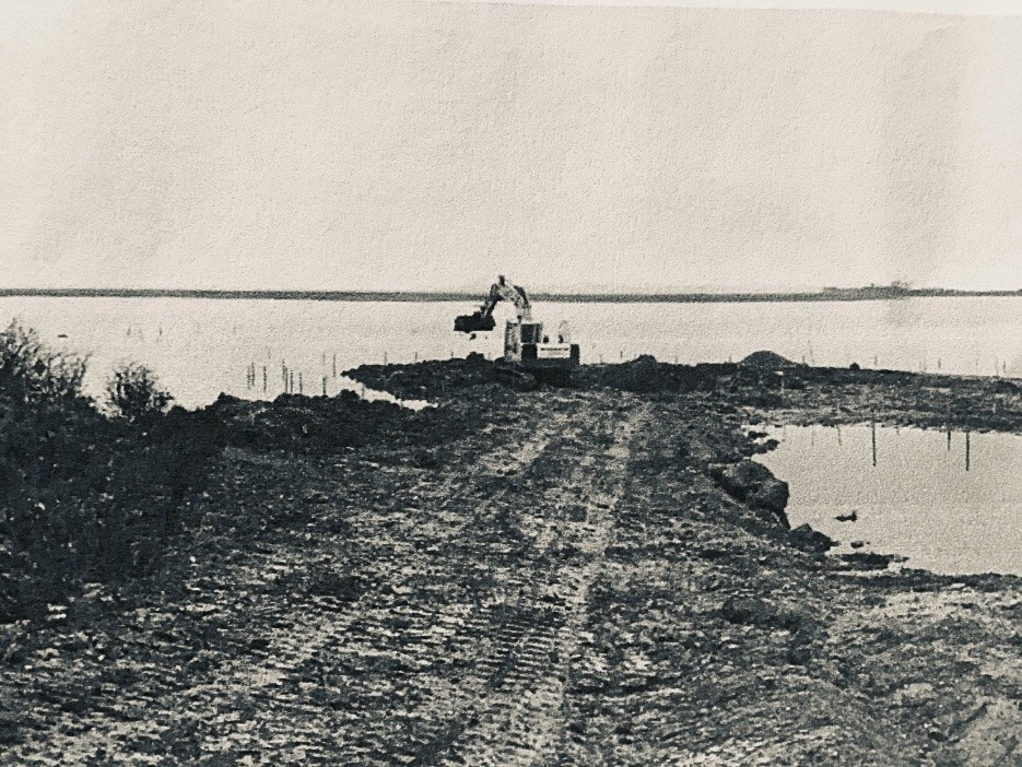 Vejanlæg kan være ”brutale” set med nutidens øjne. På billedet herunder kan du se hvordan man i 1965 anlagde dæmningen: ”Et arbejde, der kunne laves af enhver idiot”. Det blev det så i samarbejde med fredningsmyndighederne, der tilbageholdt fredningen, der ellers var besluttet tilbage i 1961. Her blev kun området ved Dyndkrogen fredet. Bøjden Nor var ejet af Steensgård Gods (tidligere Hvedholm Gods) og efter en meget stor erstatning til godset blev Bøjden Nor så først fredet i 1968/69.