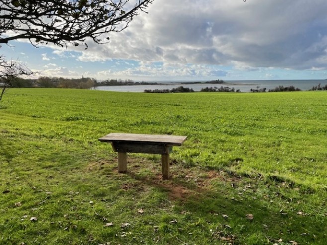 Bænken er placeret i den nordlige ende af den lille lund med gravhøjen. Den står i kanten mod vest, hvor den bevidst er sat lidt skævt i forhold til kanten. Dermed får den retning mod Bøjden Færgehavn hen over Bøjden gamle havn. Der er en flot udsigt over mod Helnæs og videre mod nord mod Illumø. I slutningen af juni vil der på skyfrie dage dannes et magisk rødlig eller orange lys, når solen går bag Helnæs. Først når solen er helt væk, må man klappe!