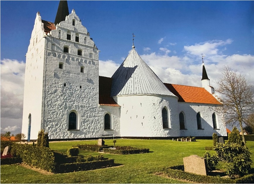 Kirken kom til at høre under lensgrevskabet ”Brahesminde” under enevælden o.1660. Det er interessant at gå rundt om kirken, hvor der på kirkegården er anlagt Hornelabyrinten, en kopi af labyrinten i domkirken i Chartres i Frankrig. Desuden er der anlagt et udendørs, rundt kirkerum ”Den Blå Pause” med en skulptur af Keld Moseholm ”Kysset” (Se foldere i kirken).