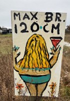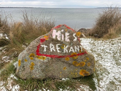 Den farverige sten med navnet ”Mies Trekant” er sat op af en god ven til Mie, den meget underfundige Preben Bladt, der også bor i Dyreborg. Preben har igennem mange år ”døbt” steder og huse i Dyreborg, samt lavet underfundige skilte og ”installationer”. Længere fremme ved stranden ser du et skilt, der angiver max. bredden for kvinder på stien og oppe ved slæbestedet har Preben lavet det geniale kugletermometer, der angiver den præcise badevandstemperatur .