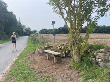 Bænken er en af de vejbænke, hvor man med læ fra diget, kan hvile sig eller indtage lidt mad og drikke. Her er det oplagt at tale med de mennesker, der cykler eller går forbi – godt hjulpet af den stejle bakke, der får alle fra vest ned i fart. Og selvfølgelig hilser man på alle. Det gør man her langt ude på Horne Land.